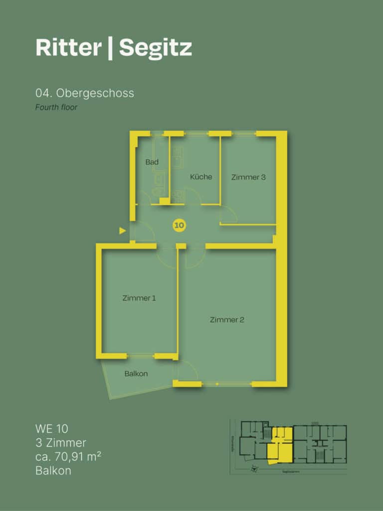 The condominium in Ritter | Segitz impresses with its functional layout, south-east-facing balcony, which catches the morning sun, and bright rooms. The apartment is conveniently accessed via the entrance at Ritterstrasse 1, where an elevator ensures comfortable living on all floors.