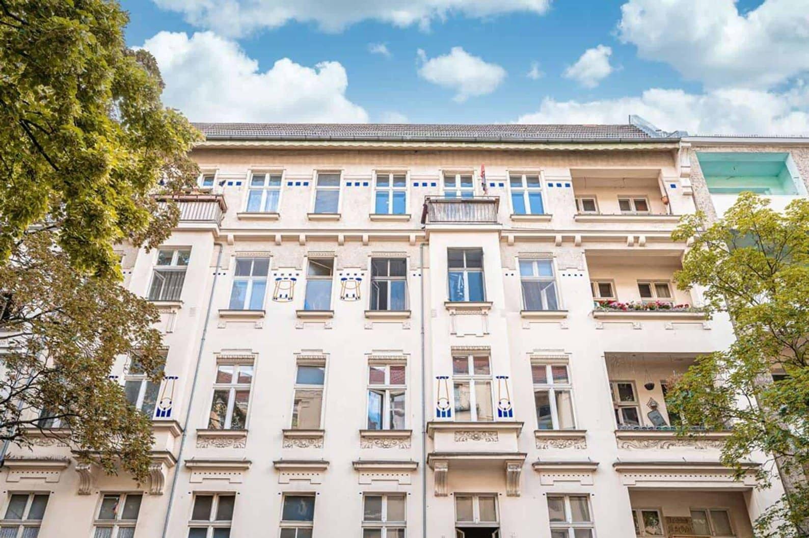 Built in the early 20th century, the apartment building at Boddinstraße 64 consists of a front building, a side wing and a rear building, which are built in a classical perimeter block design and are grouped around a green inner courtyard. The beautiful street-side façade has a restrained gracefulness, with stucco ornamentation that picks up on stylistic elements of Art Nouveau and Art Deco. Bay windows and balconies lighten up the façade and emphasise the bourgeois tranquillity of this old Berlin building. The staircase and building entrance impress with their clear formal language with delicate stucco and floral details in the banisters and historic window glazing.