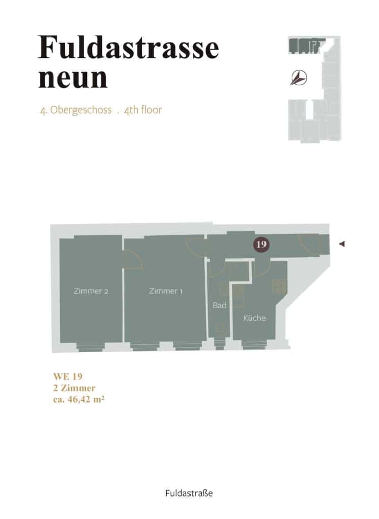 On the ground floor and four upper floors, the the property offers on clearly structured floor plans a total of 16 residential units with 1 to 3.5 rooms and and 3 commercial units with up to eight rooms. Balconies with a view of the Fuldastraße can be found in all apartments from the first to the fourth upper floor in the front building. From the rooms of the units in the rear building have a view into the landscaped inner courtyard.