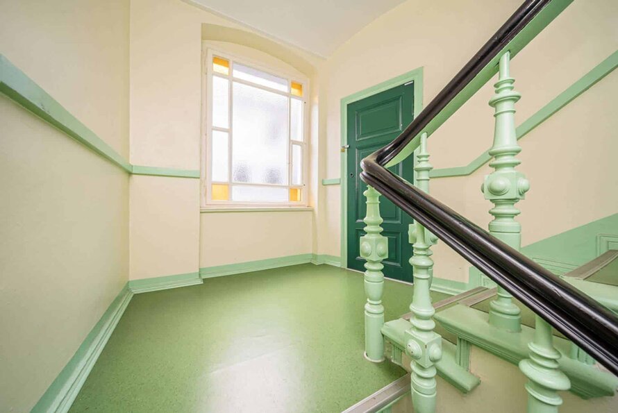 The plain facade in blue-gray pastel shades and geometrically designed moldings of the facades only betray its age upon closer observation. But the decorated entrance and apartment doors, the segmented windows, and the turned banisters in the interior of the buildings reflect the charm of times past in the cared for residential buildings.