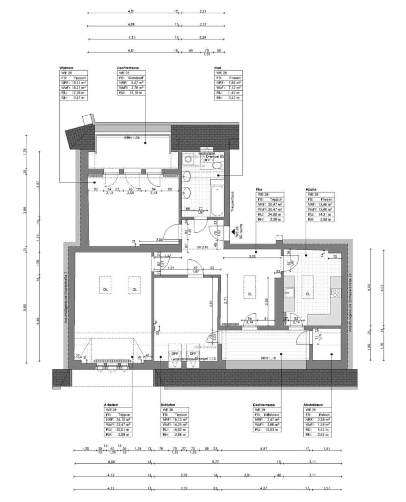 The units extend over five levels from the first floor to the top floor and range from compact 1-bedroom apartments to spacious 4-bedroom apartments with living spaces of up to 150 m². Many of them feature charming old building details such as large double-glazed windows, stucco ceilings and lovingly decorated entrance doors. Each unit has its own cellar compartment for additional storage space. Most apartments also offer a balcony or terrace for relaxing hours outdoors. A small landscaped courtyard with paved paths and a shed round off the overall picture.