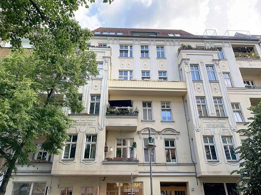 Built around 1900, the apartment building consists of a front building, rear building and two side wings and has a full basement. The building presents itself in a classic closed development with an inner courtyard and beautiful Art Nouveau style elements, typical of the turn of the century in Berlin.