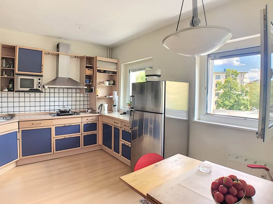 The 66 m² apartment on offer here is located on the 2nd floor of the building and offers a spacious kitchen with a fully fitted kitchen that provides space for a nice dining area. The spacious living room has a large south-west-facing window front, in front of which there is a generous balcony. The view from here extends over the treetops directly across to Nürnberger Platz, which cannot be built on. A small hallway leads to the tastefully and attractively furnished shower room and the bedroom, which, like the hallway, has practical built-in wardrobes.