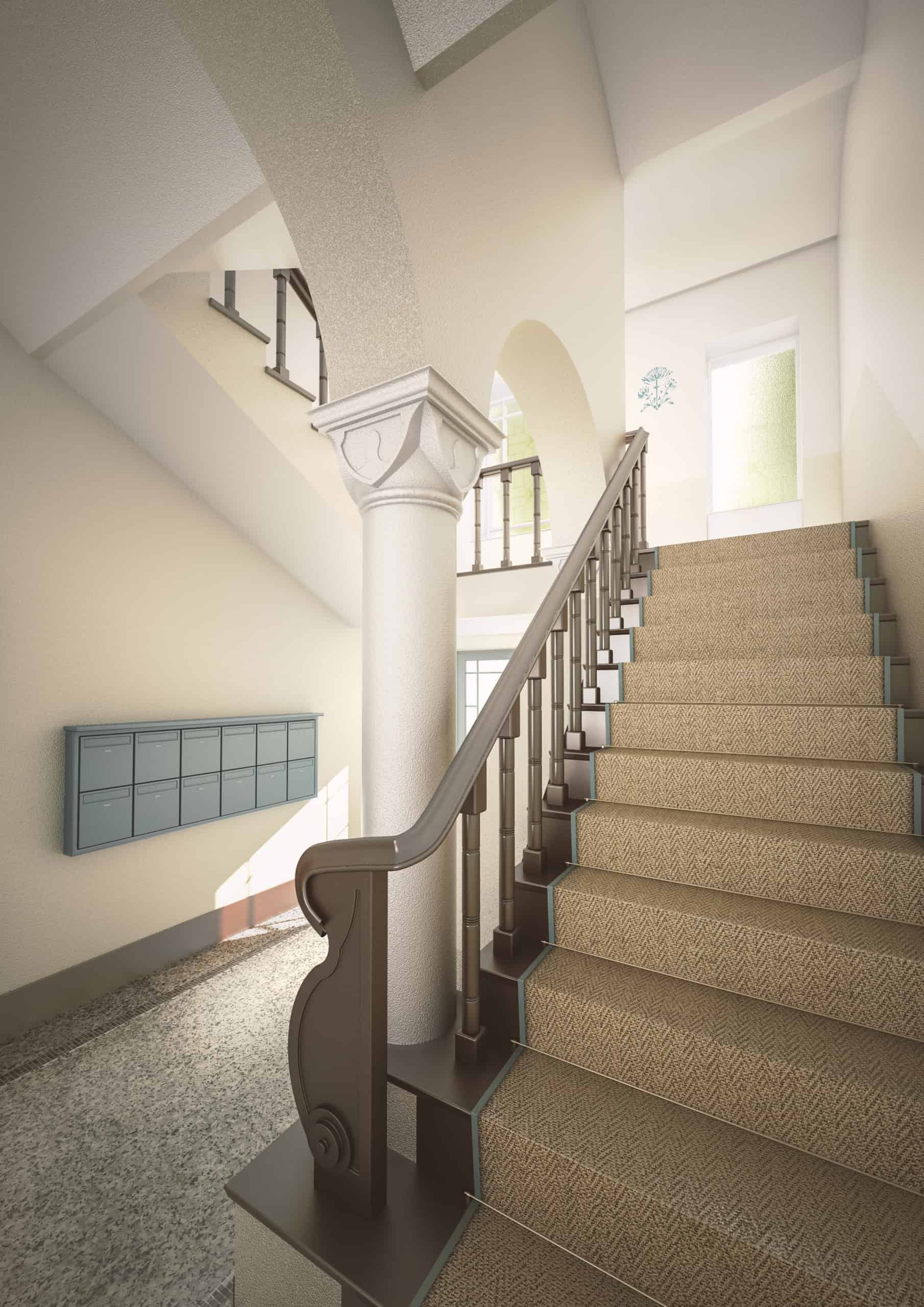 The classic old building in Emser Strasse shines in a new world of color. The façade has been refurbished and the beautiful loggias have been highlighted. The entrance area is illuminated by an elegant chandelier. Striking pillars point the way to the courtyard area, from which the side wing can be reached. The newly designed inner courtyard offers a quiet zone. Design accents in petrol give the house its own character.