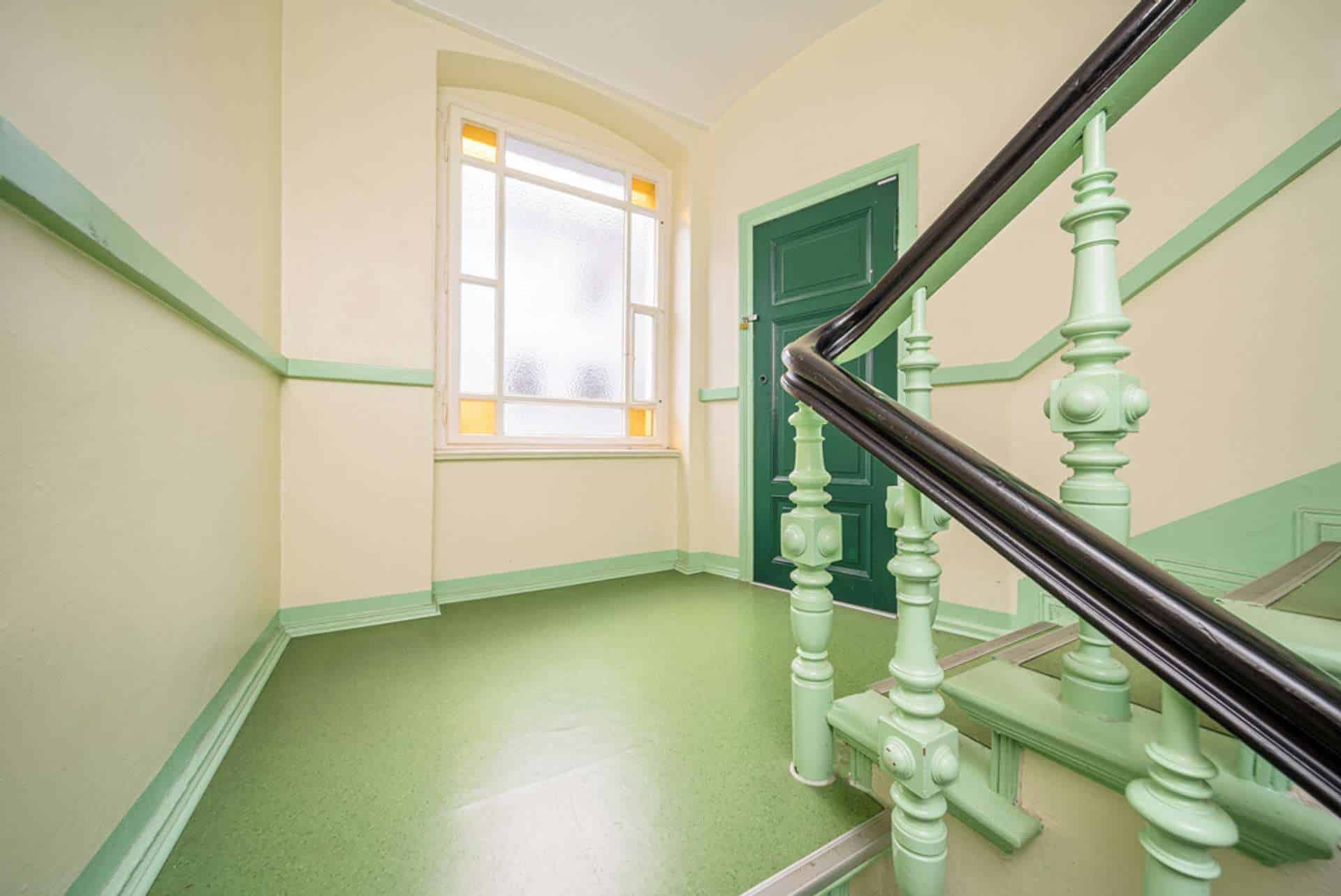 Die schlichte Fassade in pastellfarbenen blaugrauen Nuancen und geometrisch gestalteten Faschen der Fassaden verraten das Baujahr erst bei genauem Hinsehen. Doch die verzierten Eingangs- und Wohnungstüren, die unterteilten Fenster und das gedrechselte Treppengeländer im Inneren der Gebäude spiegeln den Charme vergangener Zeit in den gepflegten Wohnhäusern wider. Farbliche Blickfänge sind die in Mint- und Moosgrün gestalteten Details und Türen der Treppenhäuser, die in den Geschossen lindgrünen Bodenbelag in satten Farben ergänzen.
