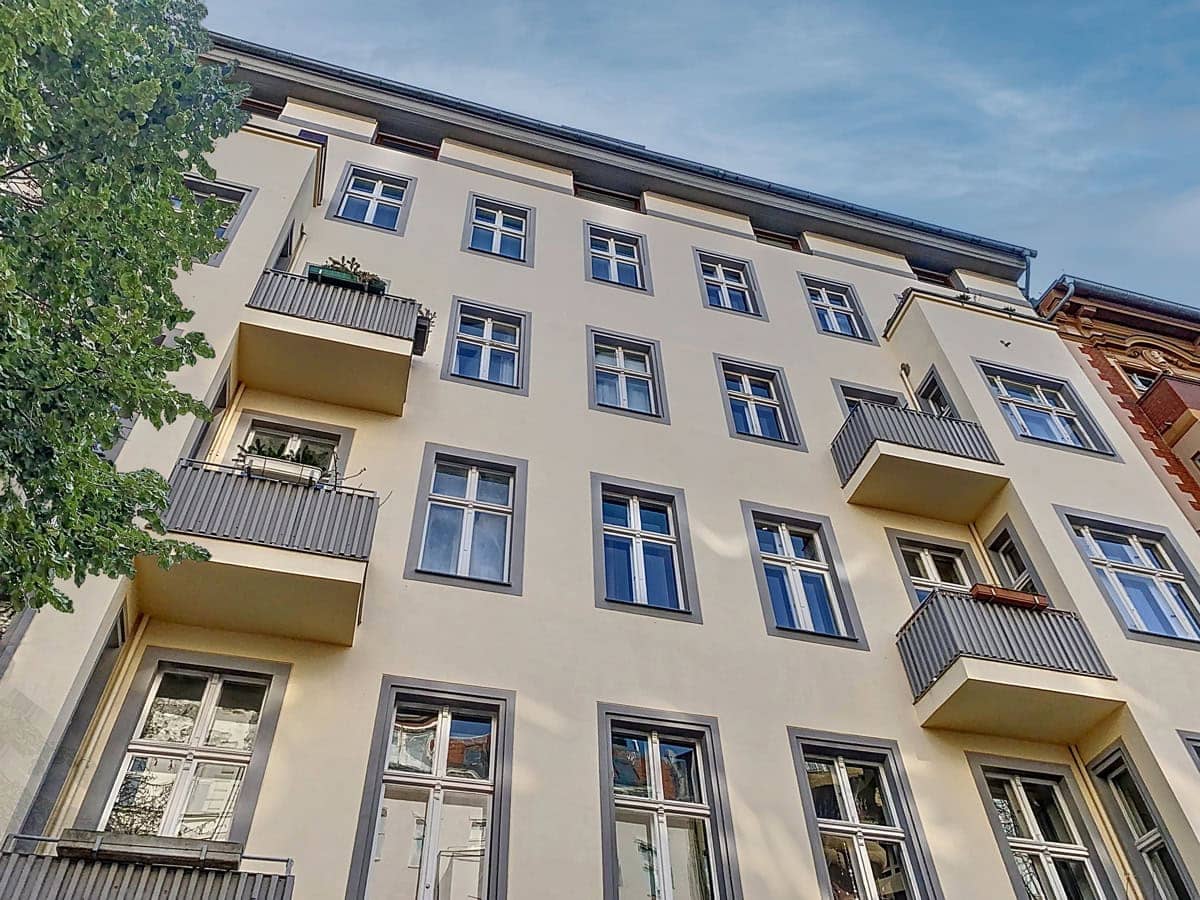 Das schöne Gründerzeitgebäude aus der Jahrhundertwende besteht aus Vorderhaus, Seitenflügel und Hinterhaus, die sich um einen schön angelegten Innenhof gruppieren. Die Fassaden sind schlicht und letztmalig in 2014 renoviert worden. Der Hauseingang und das Treppenhaus empfangen mit opulentem Stuck der Berliner Gründerzeit. Die originalen Türen und die historischen Details des Treppenhauses sind gut erhalten. Straßenseitig verfügen die Wohnungen noch über Doppelkastenfenster.