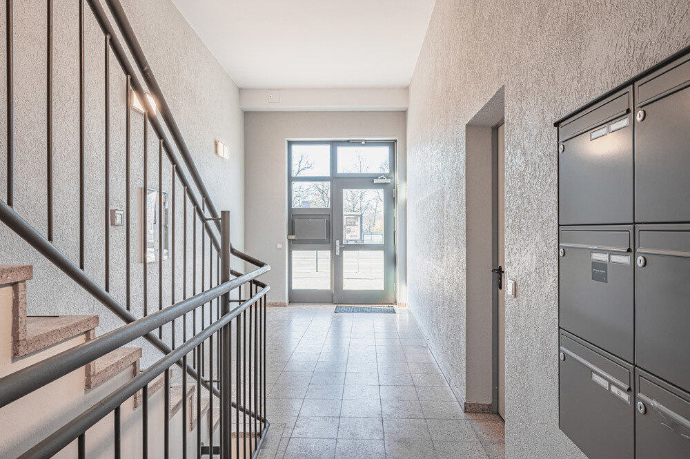 Hinter einer schlichten und klar strukturierten Fassade verbergen sich 34 Wohneinheiten, sowie eine Gewerbeeinheit, die sich in geschlossener Bauweise um einen kleinen Innenhof über Erdgeschoss und insgesamt sechs Obergeschosse gruppieren. Das unterkellerte Gebäude bietet außerdem Tiefgaragenstellplätze, die über einen Aufzug erreichbar sind. Ein Personenaufzug führt vom Kellerbereich über alle Etagen bis ganz nach oben und bindet damit jede Wohnung im Haus bequem und ebenerdig an. Das Objekt wird zentral über Fernwärme beheizt, verfügt über Kunststoff-Isolierglasfenster und bietet Kellereinheiten für die Mehrzahl der Wohnungen.