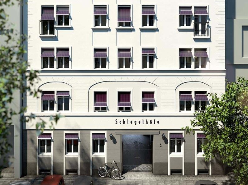 Die Schlegelhöfe bestehen aus drei Häusern, benannt nach den Vornamen der Brüder Schlegel: das Vorderhaus „August“, das Quergebäude mit Seitenflügel „Wilhelm“ und das Hinterhaus „Friedrich“. Die Geschichte der Romantik spiegelt sich in Schriftzügen an Fassade und Häuserwand wider. Zitate und biografische Auszüge schmücken den Eingangsbereich. Treten Sie ein – in ein Stück Original Berlin.