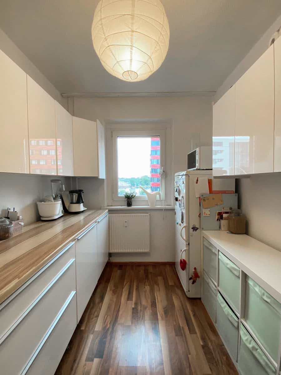 Die im 2. OG des Hauses gelegene Wohnung verfügt über eine Wohnfläche von 59 m², die sich in ein geräumiges Wohnzimmer mit Zugang zur Küche, zwei Schlafzimmer und ein Wannenbad, sowie einen Flur unterteilen. Beide Schlafzimmer sind zum ruhigen Innenhof hin ausgerichtet. Wohnzimmer und Küche haben Ausrichtung nach Süden und bieten Blick auf das gegenüberliegende Nau-Areal entlang des Spreeufers. Die Wohnung verfügt über Laminatböden und einen absolut gut durchdachten Grundriss mit idealer Raumnutzung. Sie bietet helle Wohnräume und eine Deckenhöhe von 2,60 m und ist in gepflegtem Zustand.